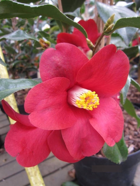 Kamelia japońska ‘Adeyaka’ to wyjątkowo elegancka i efektowna odmiana kamelii, ceniona za duże, pełne kwiaty w intensywnie czerwonym kolorze, które pięknie kontrastują z ciemnozielonymi, błyszczącymi liśćmi. Odmiana ta wyróżnia się szlachetnym wyglądem, regularnym kwitnieniem oraz zwartym pokrojem, dzięki czemu doskonale sprawdza się zarówno w ogrodach, jak i w uprawie pojemnikowej. Kwitnie wczesną wiosną, wnosząc kolor i elegancję w okresie, gdy niewiele roślin jeszcze kwitnie. Oferowana jako sadzonka w doniczce P9, gotowa do sadzenia.
